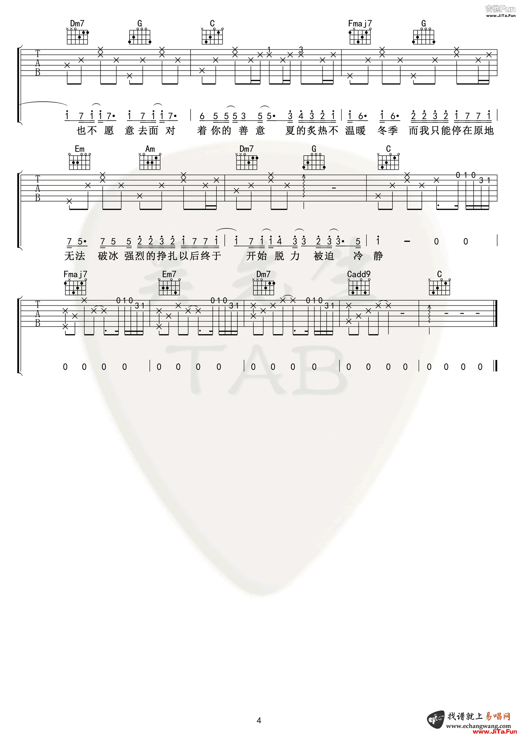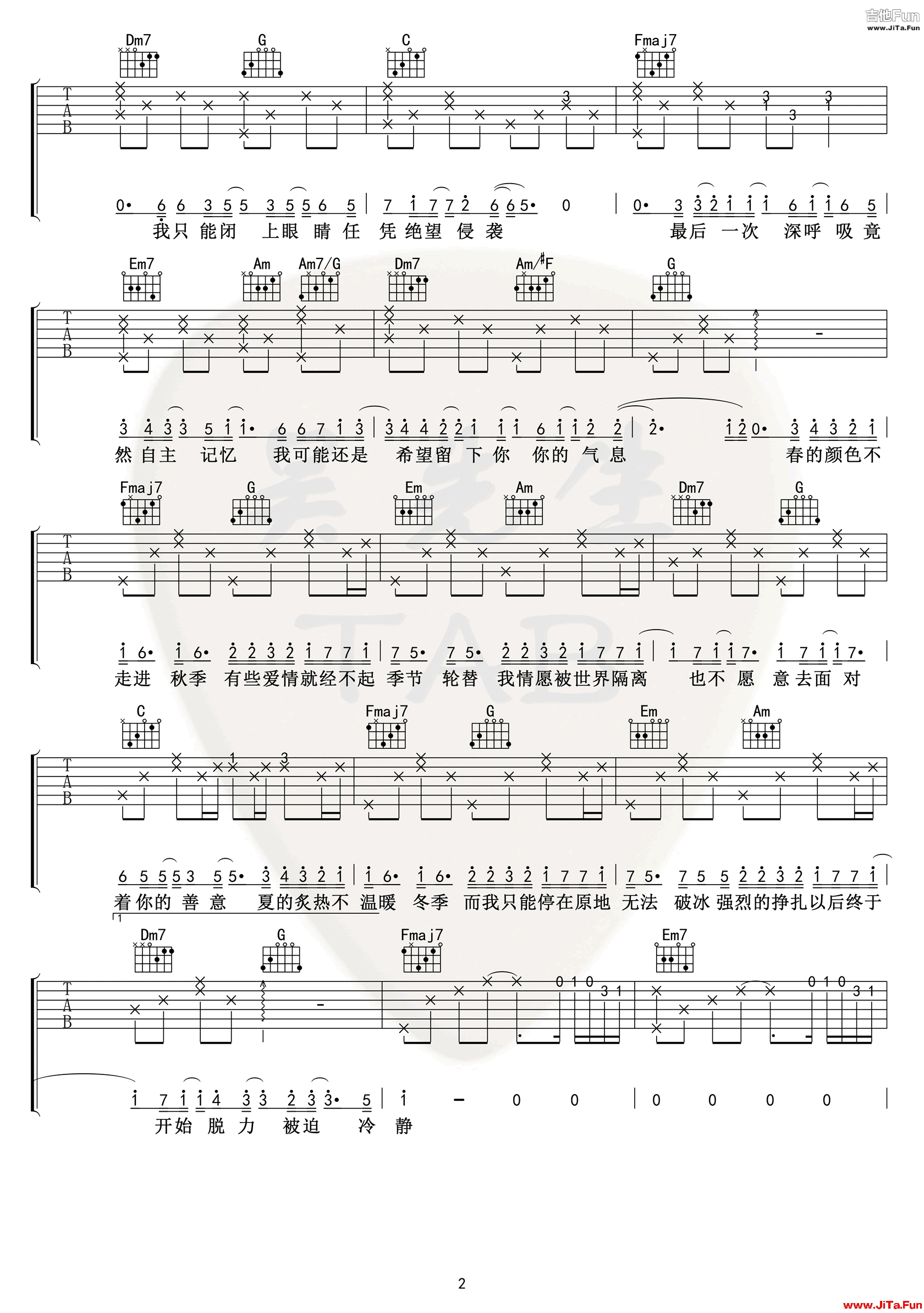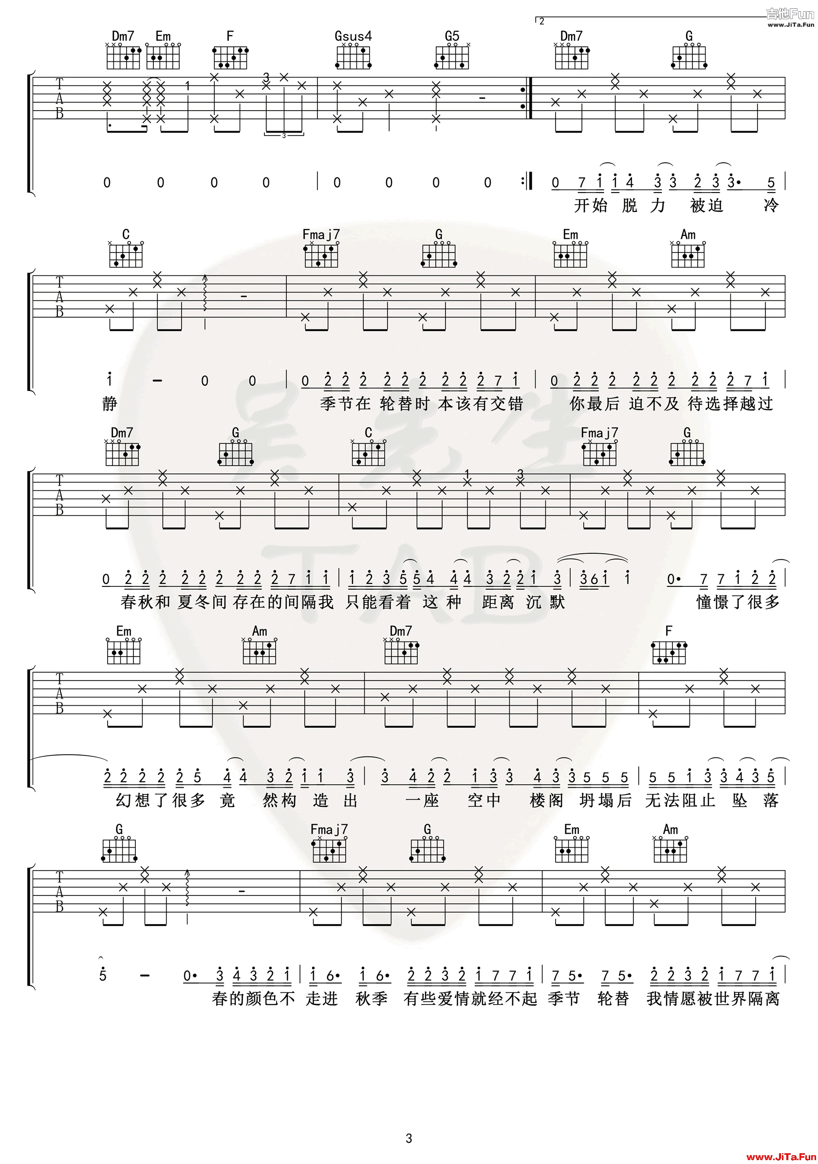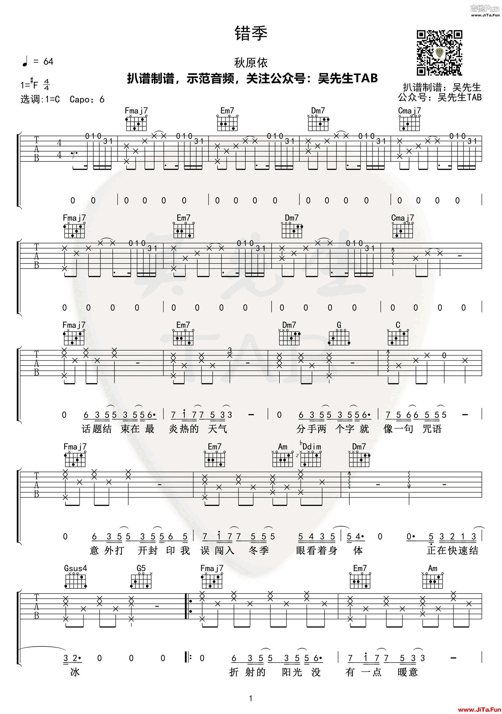 秋原依《錯季》吉他譜,歌曲原調升F調,選用C調指法編配,變調夾六品。錯季吉他六線譜,完整版共四張高清圖片譜。