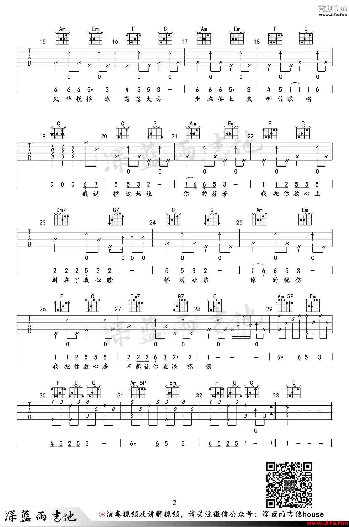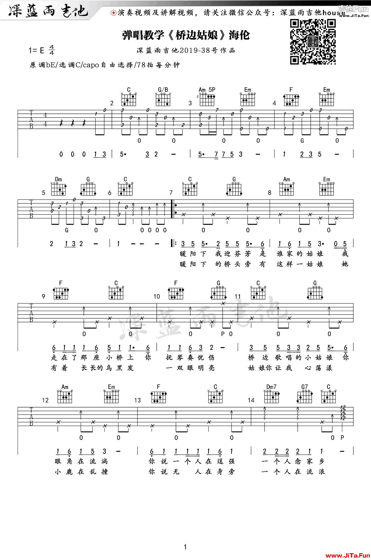 《橋邊姑娘》吉他譜,海倫演唱的一首爆火網絡的民謠歌曲,原調降E,採用C調指法,變調夾自由選擇,橋邊姑娘六線譜,兩張圖片譜例。吉他吧吉他編配,上傳分享。