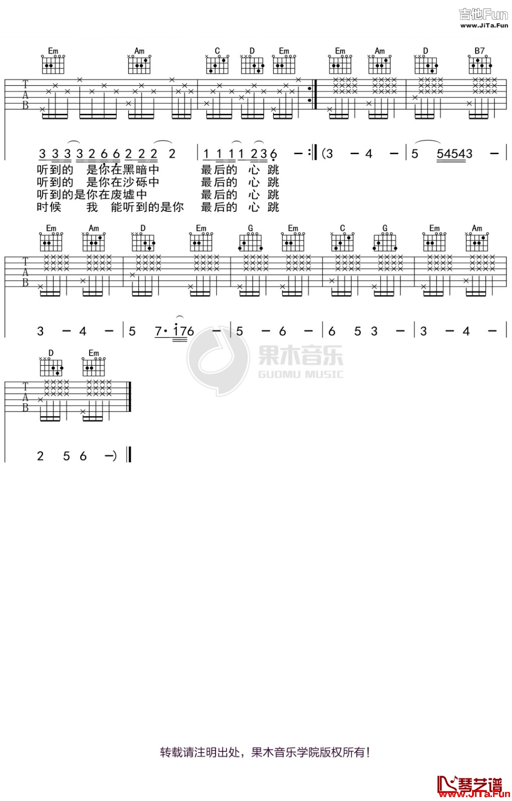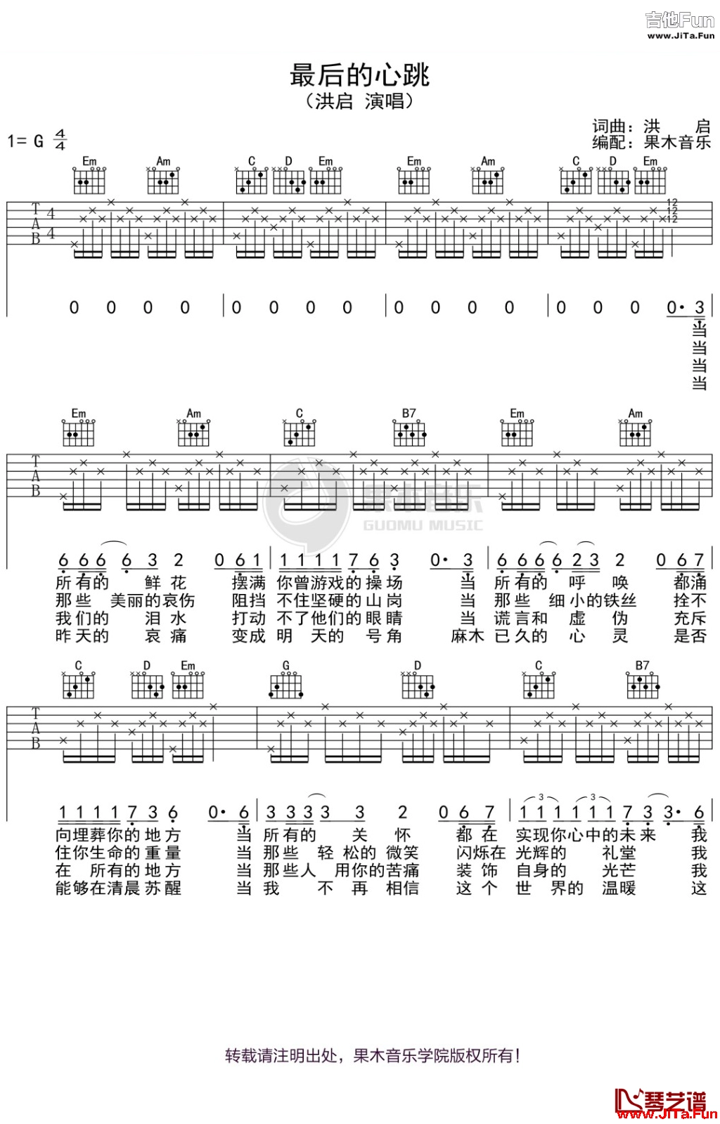 洪啟《最後的心跳》吉他譜_彈唱譜_六線譜(共2張圖片) 5小時前发布 070 粵語歌曲諧音教學 - Youtube官方頻道 最後的心跳是由歌手 洪啟演唱,作曲 : 洪啟作詞 : 洪啟,所屬專輯: 《九棵樹》。 (來源:未知) 粵語歌曲諧音教學 - Youtube官方頻道 THE END吉他譜大全# 洪啟喜歡請點贊,記得分享給朋友喲~收藏0