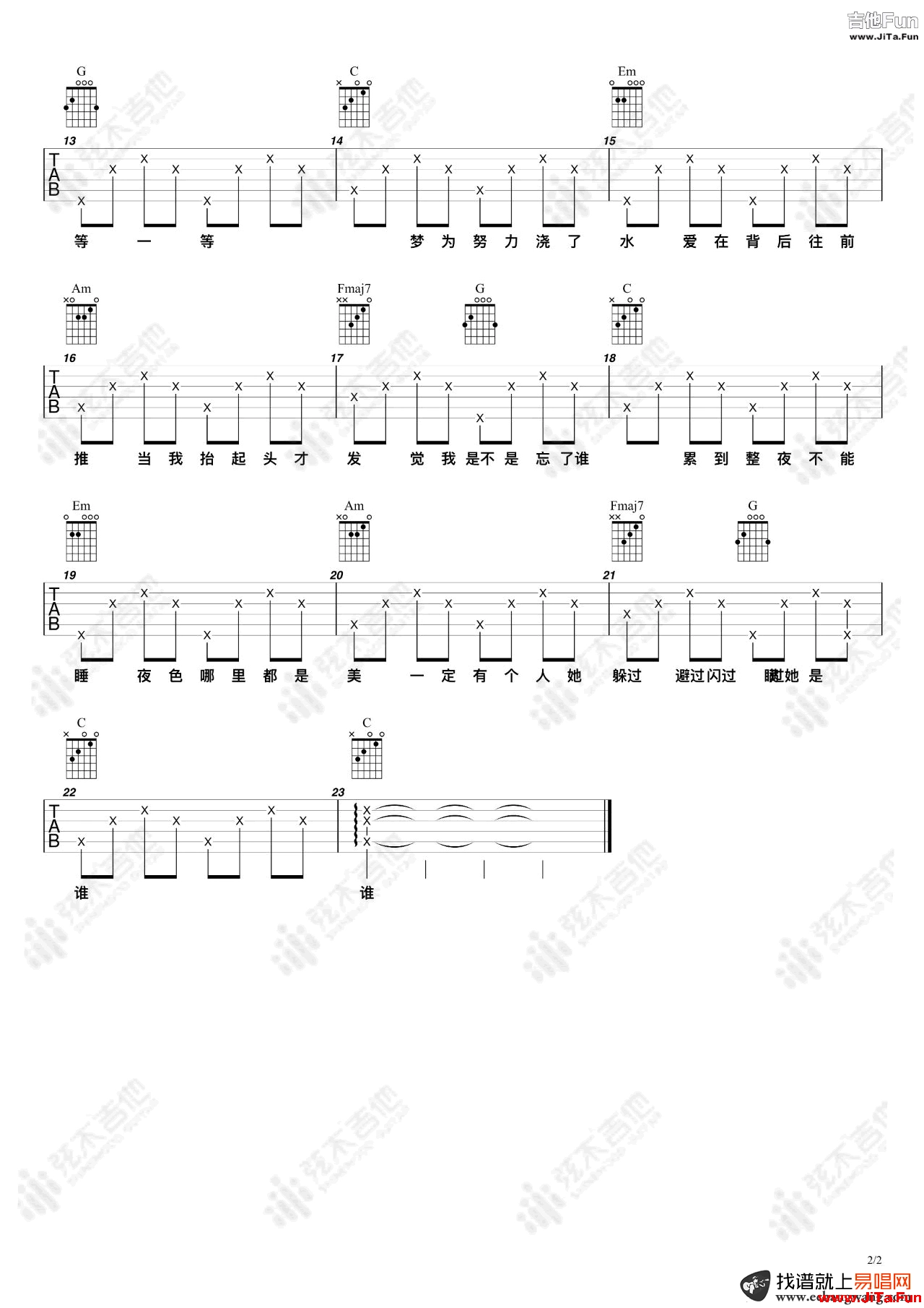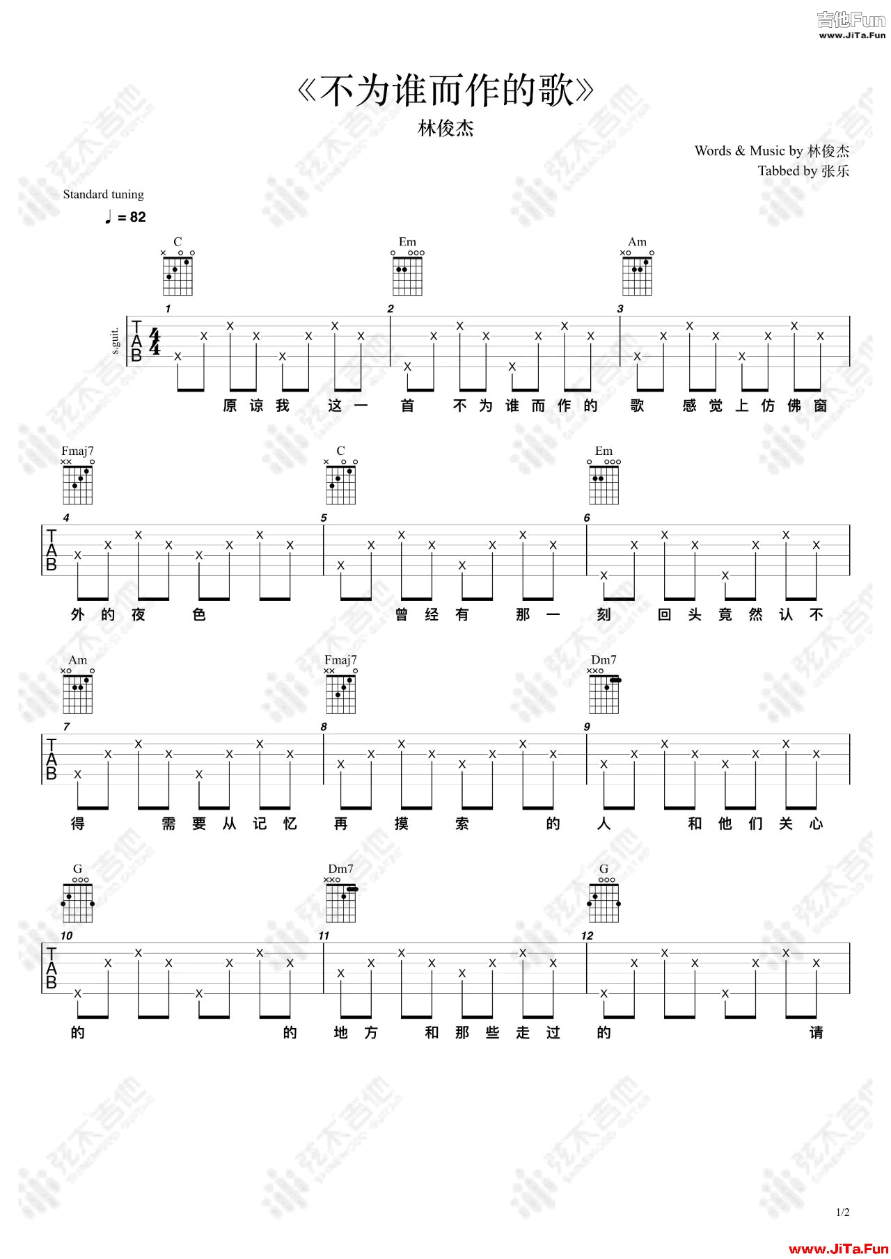 《不為誰而作的歌》吉他譜,林俊傑的一首找回自我感恩生活的歌曲,不為誰而作的歌吉他彈唱譜,C調編配,兩張圖片六線譜,弦木吉他出品,易唱吉他譜上傳更新。