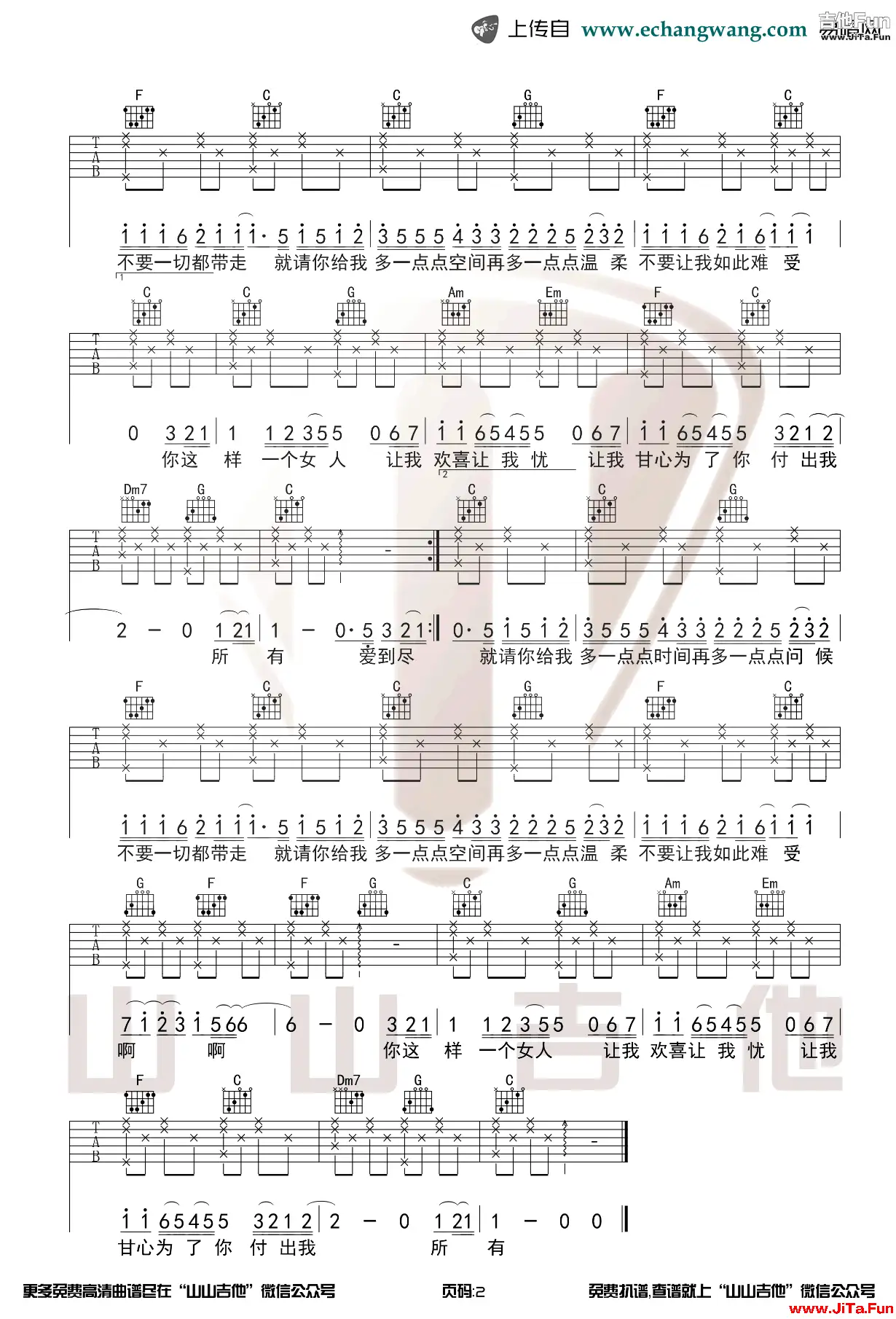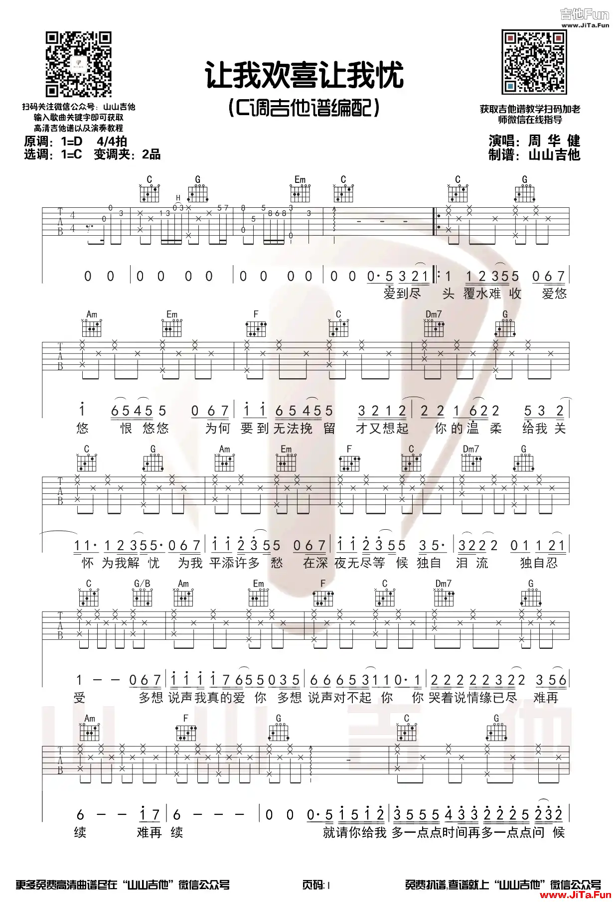 《讓我歡喜讓我憂》吉他譜,周華健的一首經典老歌,改編自日本組合恰克與飛鳥的《男女》,讓我歡喜讓我憂六線譜,C調吉他譜編配,變調夾夾第二品。兩張圖片譜例。山山吉他出品,吉他吧jitaba.cn更新上傳。