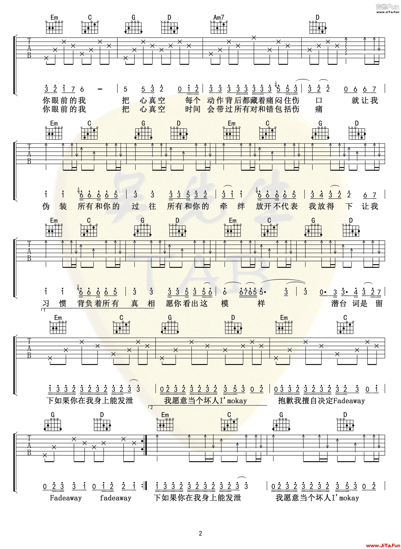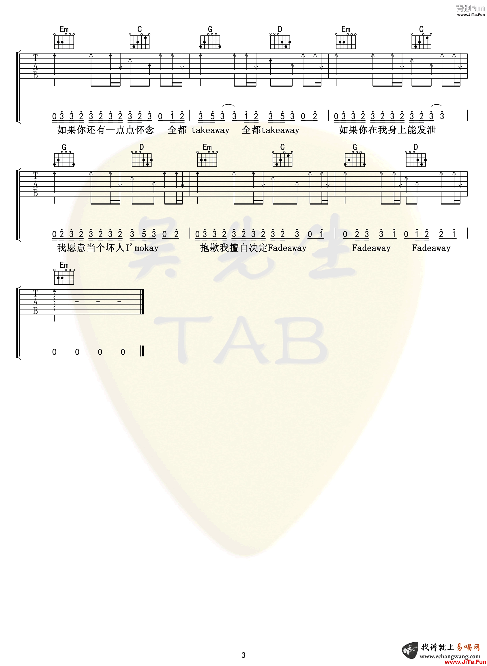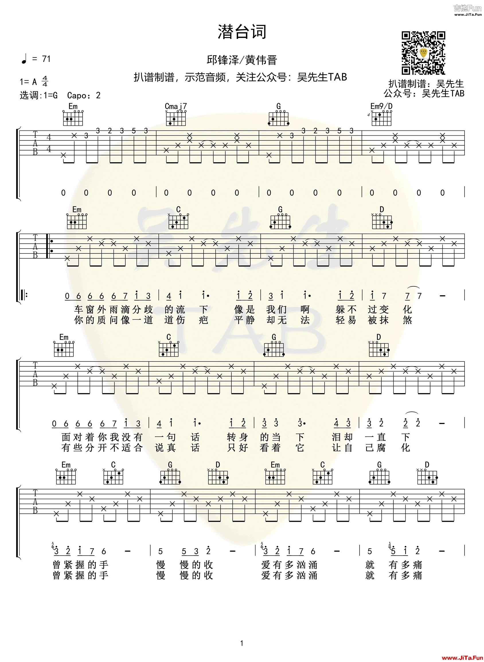 《潛台詞》吉他譜,邱鋒澤/黃偉晉演唱,歌曲原調A,選用G調指法,CAPO夾二品。潛台詞吉他六線譜,完整高清版共三張彈唱圖片譜。易唱網整理分享,吳先生TAB制譜編配。