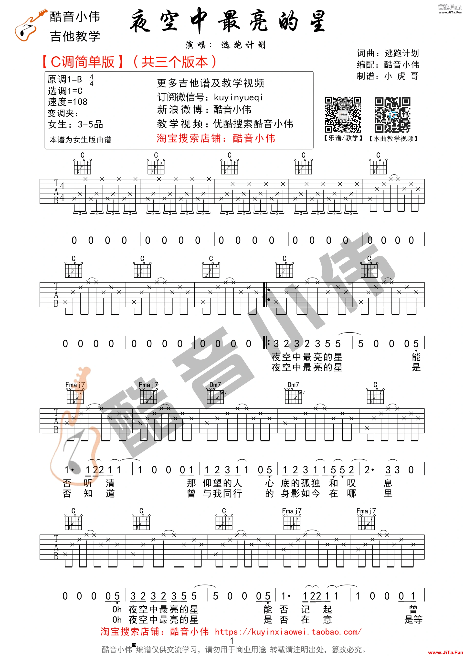 逃跑計劃《夜空中最亮的星》C調簡單版(酷音小偉吉他教學)》吉他譜(共3張圖片) 1小時前发布 070 粵語歌曲諧音教學 - Youtube官方頻道 類別:流行 歌手:逃跑計劃 來源:酷音小偉記譜 粵語歌曲諧音教學 - Youtube官方頻道 THE END吉他譜大全# 逃跑計劃喜歡請點贊,記得分享給朋友喲~收藏0